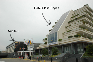 | O Hotel Meliá Sitges, o centro nevrálgico do festival. O Auditori, a sala principal, com quase 1400 lugares é o edifício mais baixo. A sala Tramuntana situa-se nas traseiras. |